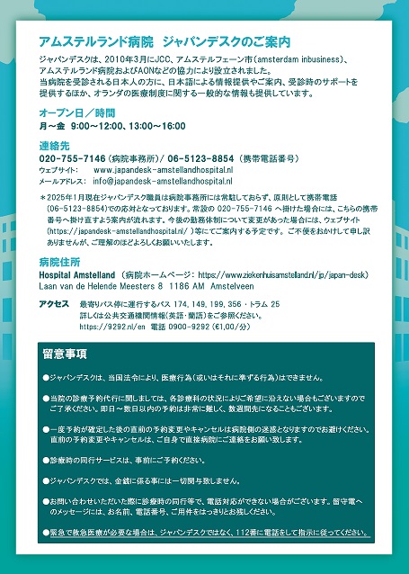 各位 アムステルランド病院ジャパンデスク基金 理事 Ferry van Schoonhoven 理事 薄 井 哲 人 アムステルランド病院 ジャパンデスク 2025年度(1月から12月) の運営支援への寄付ご協力願い 拝啓 時下ますますご清祥のこととお喜び申し上げます。 皆様におかれましては、日頃より「アムステルランド病院内ジャパンデスク」の活動へご理解、ご支援を賜り、この場をお借りし厚く御礼申し上げます。 アムステルランド病院ジャパンデスクは、日本とは相当異なっているオランダの医療制度に戸惑う日本人社会の切実な支援要請に対応するべく、2010年に、在蘭日本商工会議所(JCC)およびJCC会員企業、アムステルランド病院、Amsterdam in Business、保険会社等の協賛を受けて設立され、現在に至っています。その運営は、アムステルフェーン市のアムステルランド病院内にあるジャパンデスクに勤務する職員により行われており、財政基盤は独立した非営利団体アムステルランド病院ジャパンデスク基金(以下『基金』)により支えられています。 既にジャパンデスクをご利用された方もいらっしゃるかと存じますが、ジャパンデスクの利用は全て無料で、アムステルランド病院内で診察を受ける日本人の患者様に日本語で情報提供したり、受診時のサポートを提供するほか、オランダ国内外からの電話やメールによるオランダの医療制度全般についてのご質問やご相談にも対応しています。日本とは大分異なるオランダの医療サービスを受ける際の不安を和らげてくれるジャパンデスクの支援業務、職員の真摯な対応に対する利用者の評価は極めて高く、その数は月120件程に上ります。(詳しくはホームページをご覧ください。 ) この様なジャパンデスクの運営を維持・改善していく上で、皆様からの寄付金が必要不可欠な財源となっております。 つきましては、2025年度 (2025年1月~12月)…